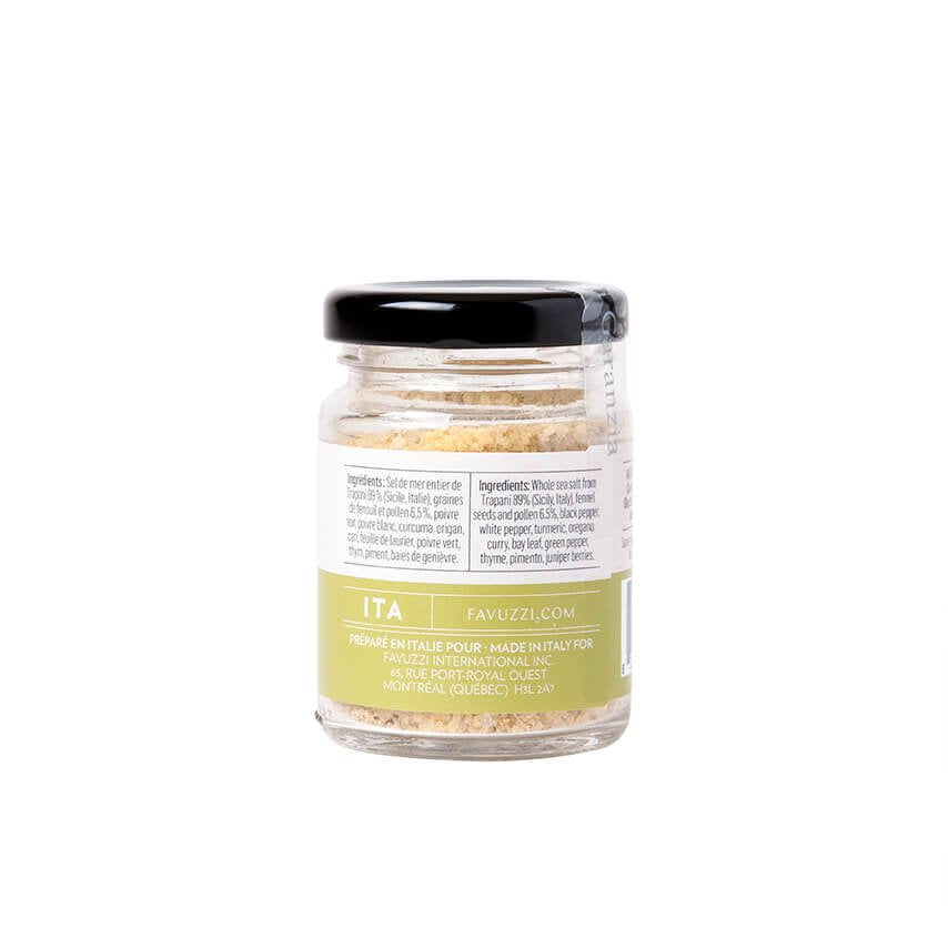 These grains of salt are flavoured with fennel seeds and pollen for a delicious aniseed taste, complemented with notes of thyme and oregano and a spicy hint of black pepper and chili.