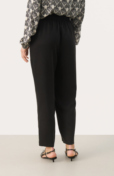 The model is 179 cm tall and is wearing a size 36. These black trousers are an essential wardrobe staple. With their comfortable elastic waist and relaxed fit, they are perfect for both work and leisure. Pair them with a patterned blouse for an elegant look or a T-shirt for a more casual style.