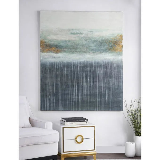 Images of storming seascapes come to mind when one takes in the complex lines, swishes and strokes within this painting. The rectangular cotton canvas elevates the paint stokes that feel reminiscent of a wavy underwater image. The addition of textures, gold paint and soft edges along its top gives the design a harmonious balance.
