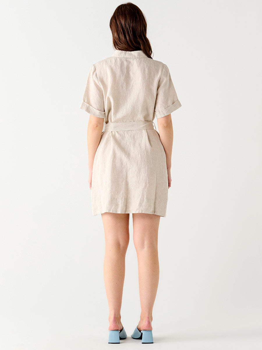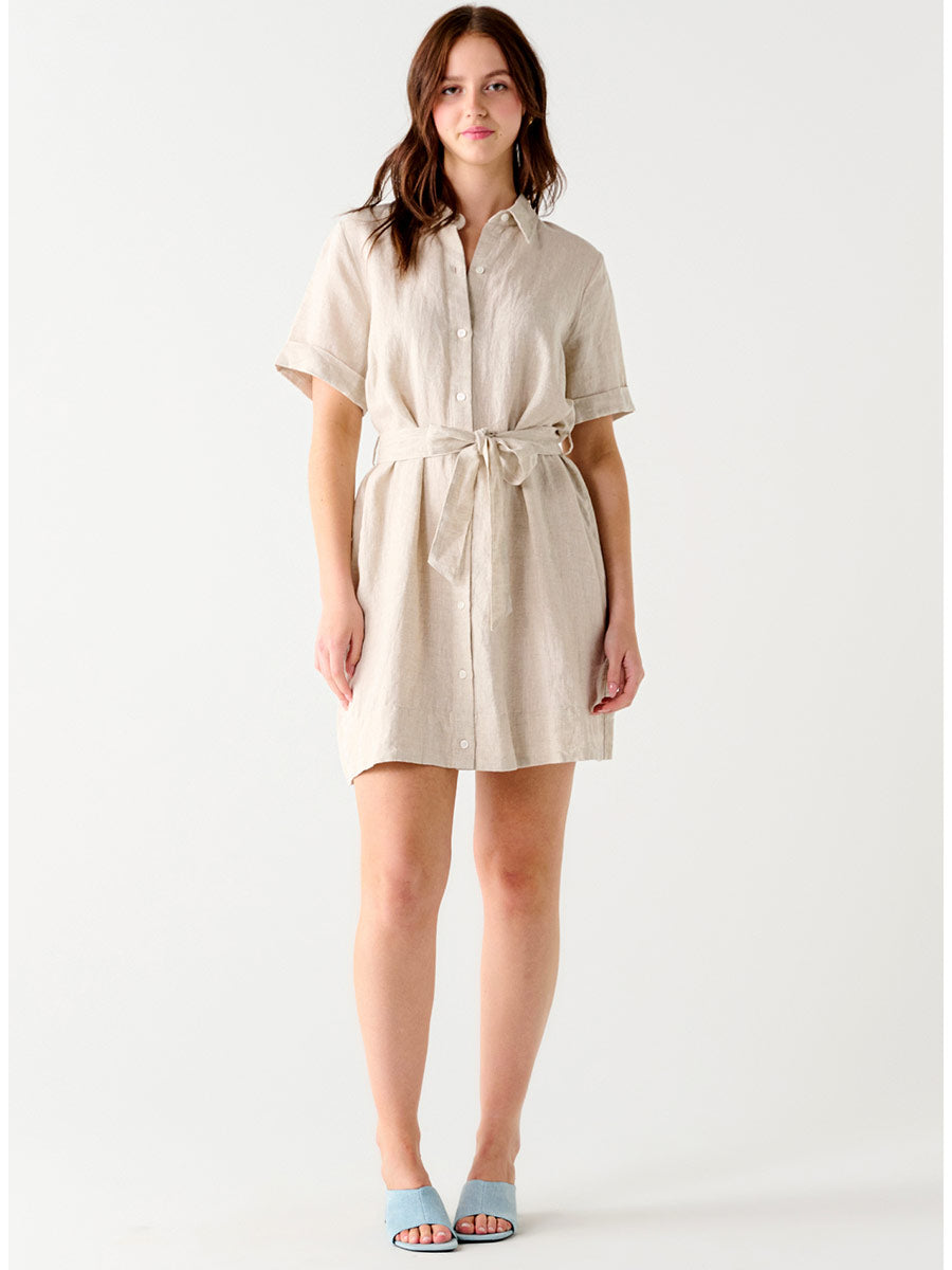 Effortless charm in every fold. This wheat-coloured dress blends simplicity with style. A shirt collar, buttoned front, and belt adds a touch of class to this pretty dress.