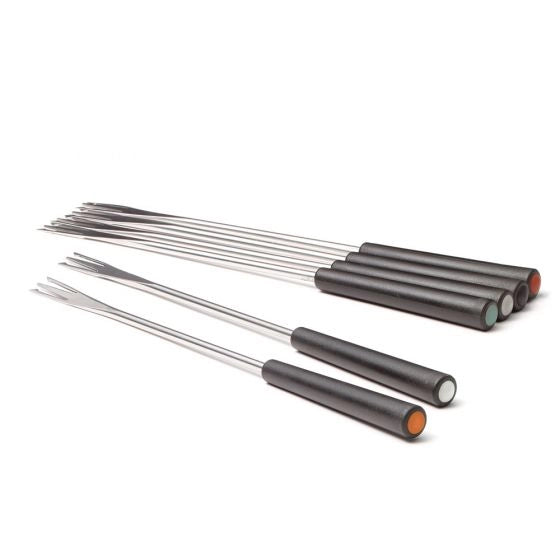 Each of the 6 fondue forks in this set features three stainless steel tines for easily dipping bread cubes in cheese fondues or pieces of meat in Chinese hot pot fondues. The heat-resistant handles are individually coloured so that everyone knows which fork is theirs.