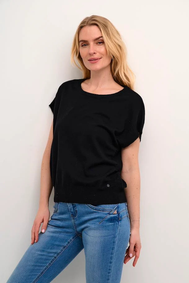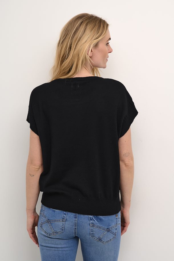 This short-length, loose-fitting knitted waistcoat showcases a stylish drop-shoulder design. Crafted from a blend of viscose, polyester, and nylon, it offers practical charm and understated sophistication for every day wear.