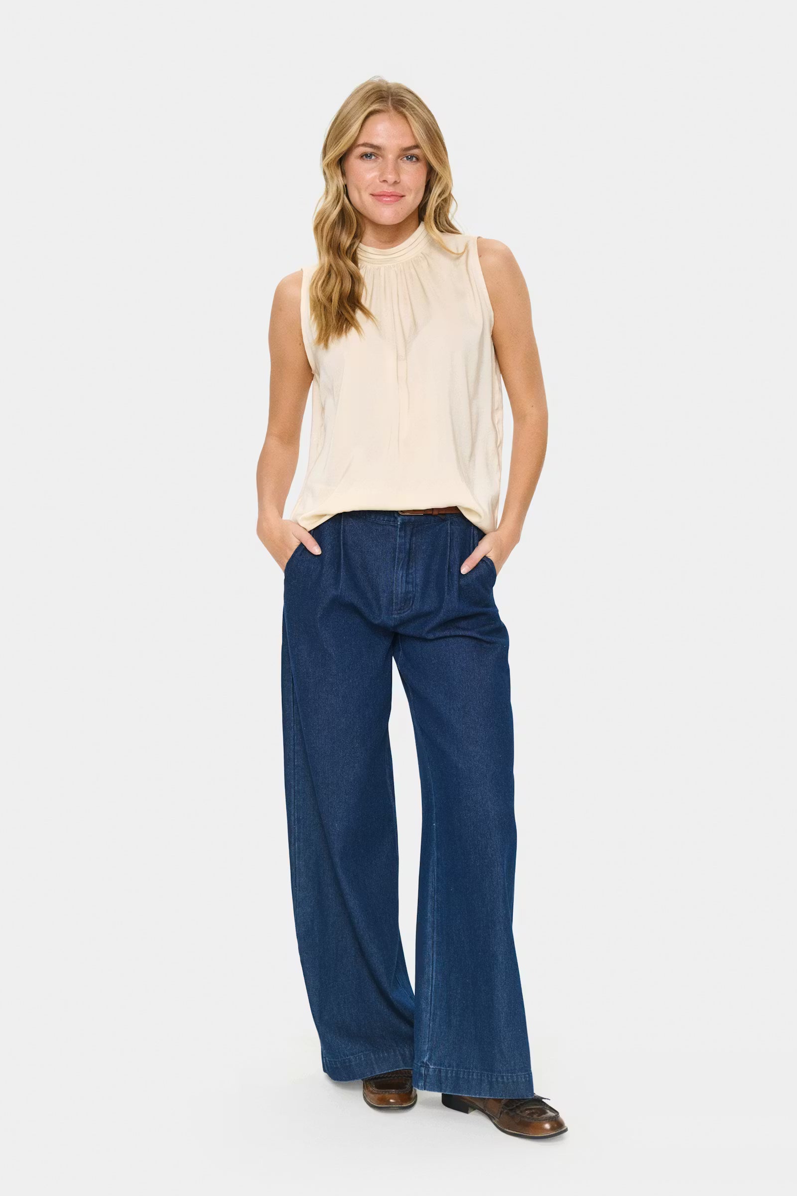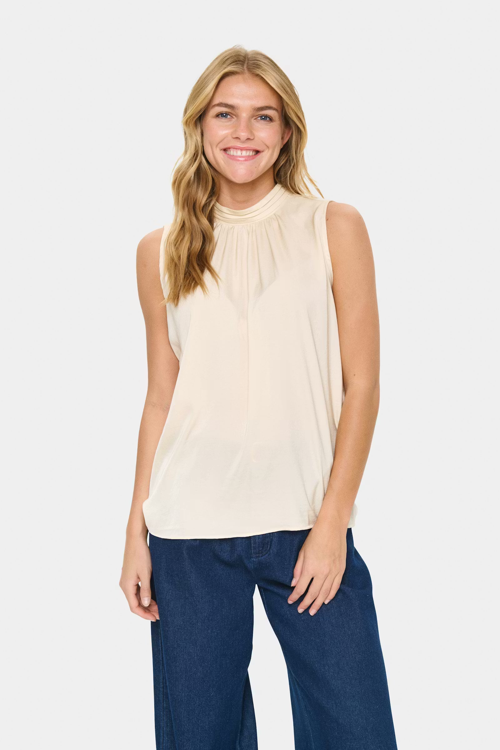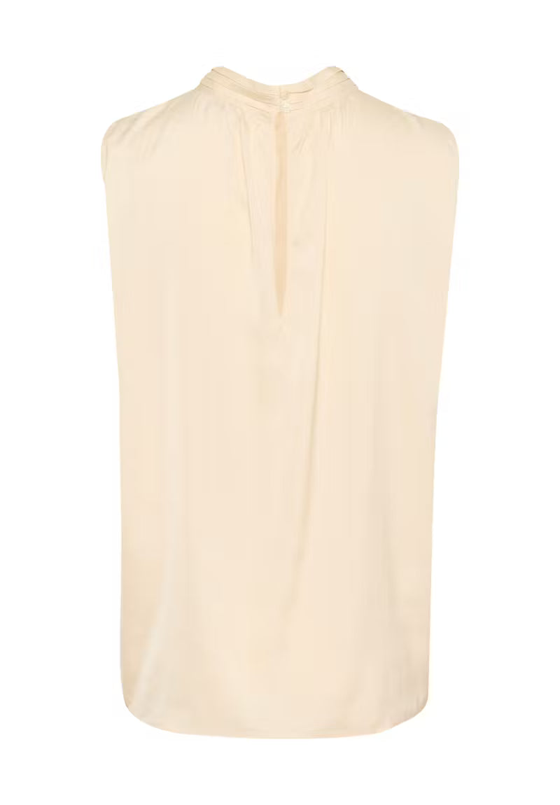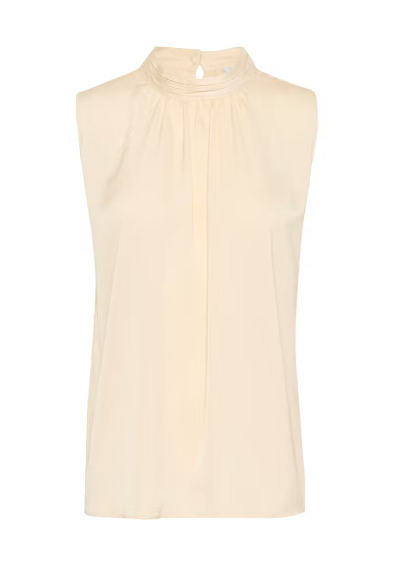 Sleeveless top in soft cream with a light, flowy fabric. Features a high gathered neckline with back button closure and front pleat detail. Relaxed fit for easy wear.  100% Polyester, Regular fit.