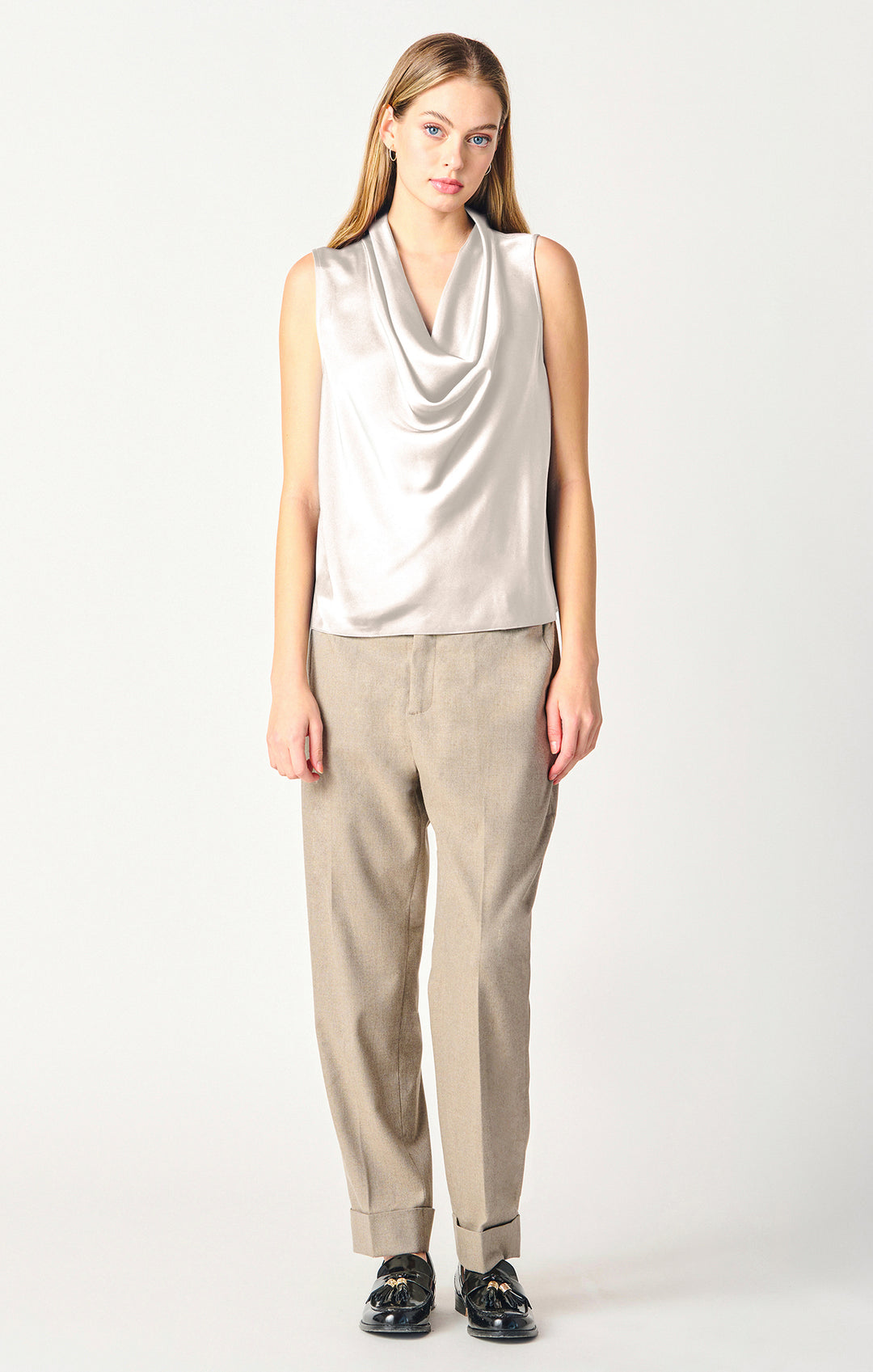 Black Tape’s satin top, elegant and refined with a draped neckline, sleeveless for a chic and modern look. Ideal for enhancing an everyday look.