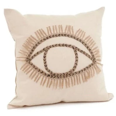 A square cushion with an embroidered eye for a boho statement piece. Jute embroidery and contrast stitching make an eye-catching accent pillow in any space.