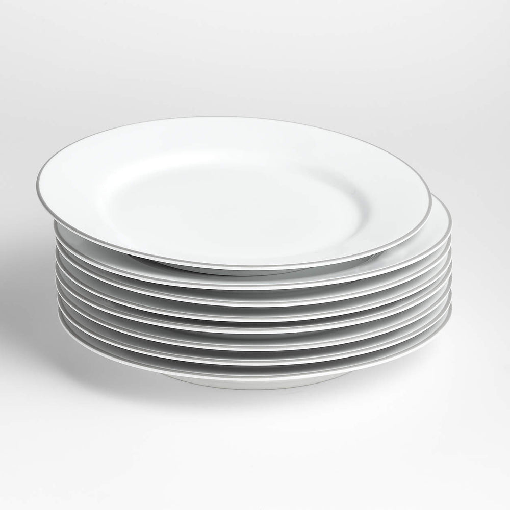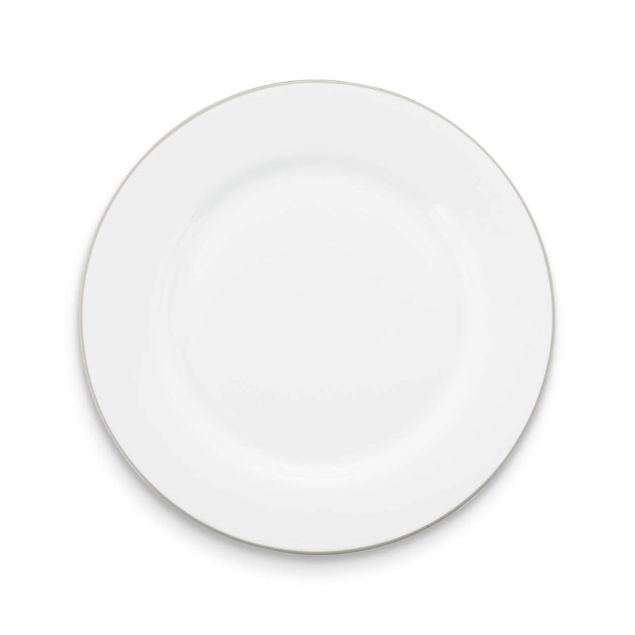 Our dinnerware is an overture of grace and simplicity. Dressing up or down with ease, this elegant white porcelain plate belies its everyday durability and ease of care. A thin grey band traces the rim, adding subtle definition to its sophisticated, modern silhouette.