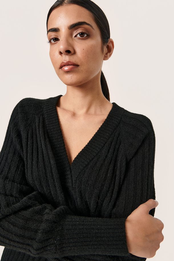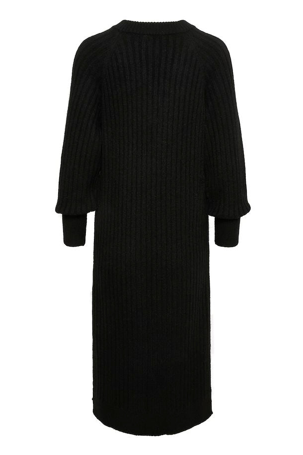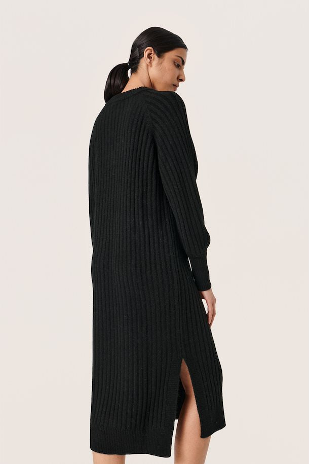 Ribbed knit dress with long sleeves and v-neck with ribbed trim. The model is wearing a size M.