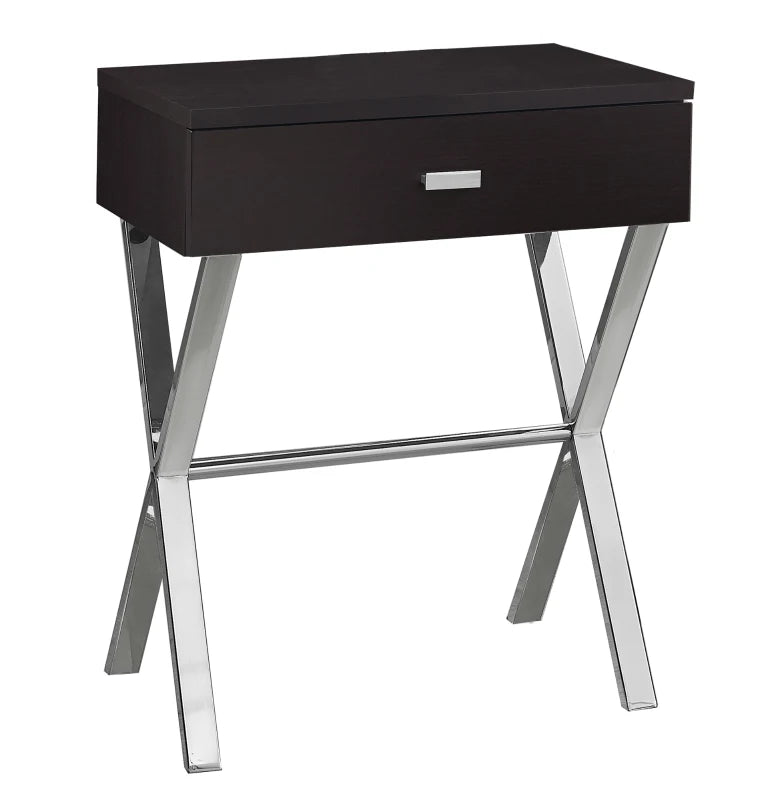 Influenced by the design accomplishments of the past, this mid-century inspired table has gone through a modern make-over. The iconic lines and styling of this side table paired with the on-trend cappuccino finish and chrome metal X base legs, give this table an edgy look that will complete your modern room setting. This versatile table can be used as an accent table in the den, living room or entry way or as a night stand in the bedroom. Featuring one storage drawer with a chrome handle, this sturdy accent table is perfect to display your favourite objects and keeping things organized in one place.
