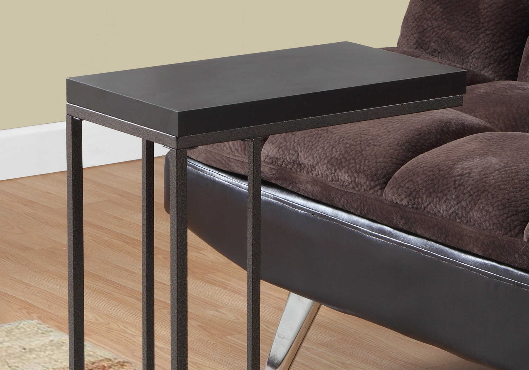 - With a trendy espresso surface, this C shape side table slips easily under your sofa, chair or bed and sits slightly off the ground to prevent damage to your floor