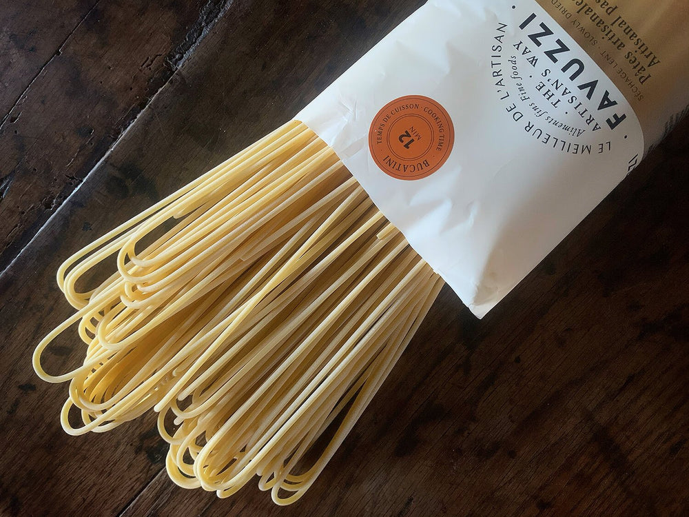 Bucatini is a long pasta with a hole inside, which facilitates uniform cooking and the ability to hold sauce. They are dried hanging on a wooden drying rack and packed by hand. Their characteristic "U" shape is a symbol of artisanal production and cannot be reproduced industrially. We use a high-quality bronze die to make this pasta, which gives it a nice porous texture to which the sauce adheres more easily.