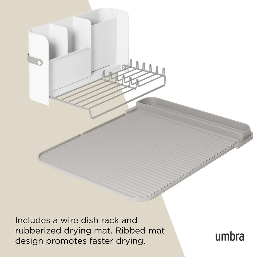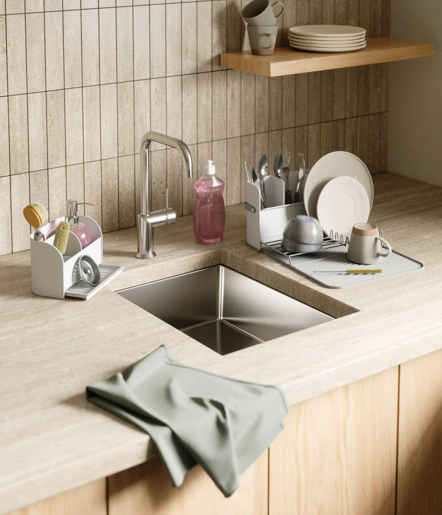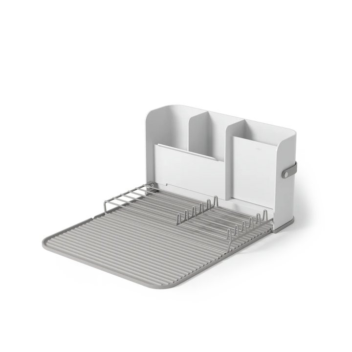 Introducing SLING DISHRACK: the space-saving and efficient solution for your dishes. This easy-to-use and durable dishrack is designed to maximize capacity while minimizing clutter. The SLING DISHRACK features a metal foldaway rack and a folding mat that fits perfectly into a convenient caddy base. The base has three divided sections for your cutlery, large utensils, or dish cleaning accessories like sponges and scrub brushes. Not only is the SLING DISHRACK incredibly functional, but it's also portable. It folds away for easy storage when you're not using it, and it's perfect for taking on camping trips. To keep everything in place, a silicone band wraps around the caddy base and holds up the mat and rack when they're not in use. Get organized with SLING DISHRACK today. Made with recycled plastic and included mat is dishwasher-safe.