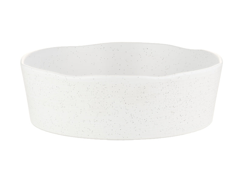 This Onni speckled white serving bowl adds effortless style to any occasion. Crafted from high-quality porcelain, this piece has been hand-finished, meaning each bowl is beautifully unique and has an earthy, natural feel. Its graceful round shape is perfect for salads, pastas and shared dishes and adds depth to both neutral and bold table settings, with a delicately embossed surface and matte speckled glaze. Combine it with the rest of the Onni collection for a seamlessly coordinated set.