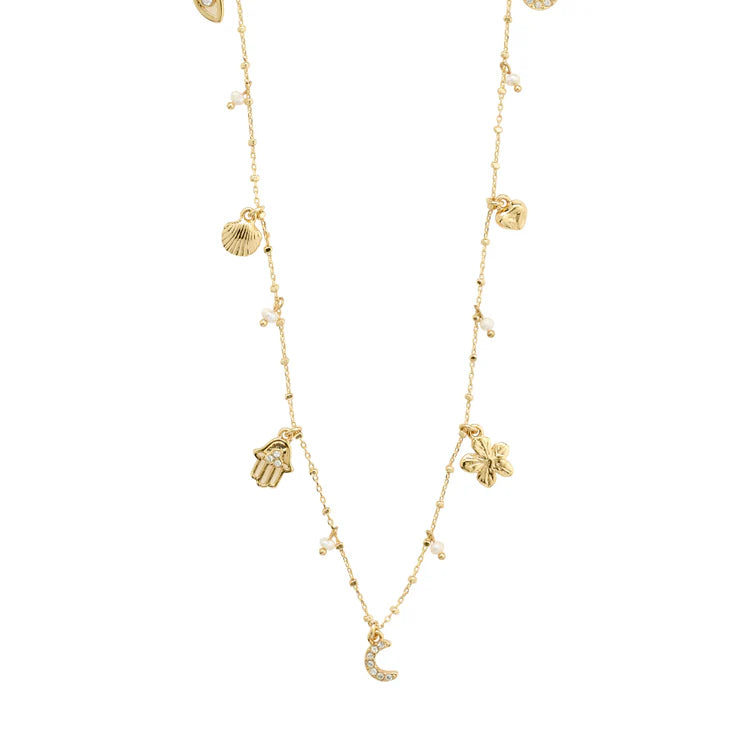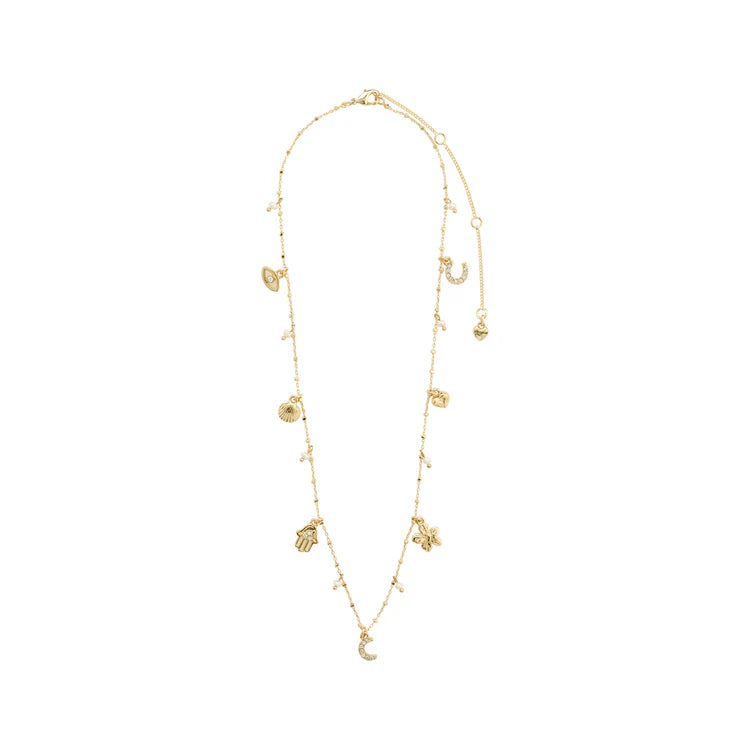 Make today special with the PRUCENCE necklace from Pilgrim - a treasure trove of charming symbolism. The gold-plated chain is sprinkled with small charms, each telling a story. From the warmth of the heart and the beauty of flowers and the mystery of the moon to the horseshoe symbolizing happiness. The Hamsa, seashell and all-seeing eye add a fairytale dimension to your look, while tiny freshwater pearl and sparkling Preciosa crystals add a touch of elegance. Wear a universe of symbolism around your neck and feel connected to the wonders of the world. Designed with a comfortable length of 38 cm plus a 9 cm extension chain. Made from 90% recycled material, the PRUCENCE necklace is not just a piece of jewelry - it's a celebration of life.