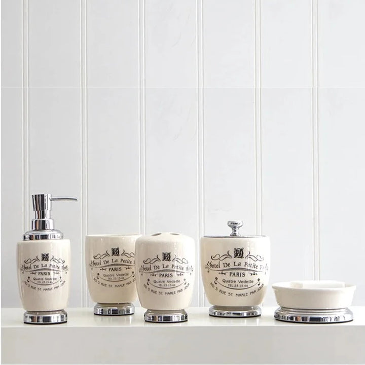 ELEGANT AND DELICATELY DETAILED PARISIAN THEMED BATH ACCESSORIES. NON-SKID BOTTOMS. EASY TO CLEAN – WIPE WITH A DAMP CLOTH.