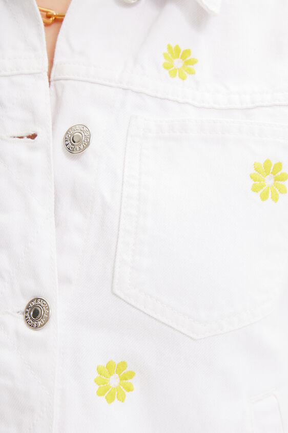 A denim trucker-style jacket with contrasting daisy embroidery.