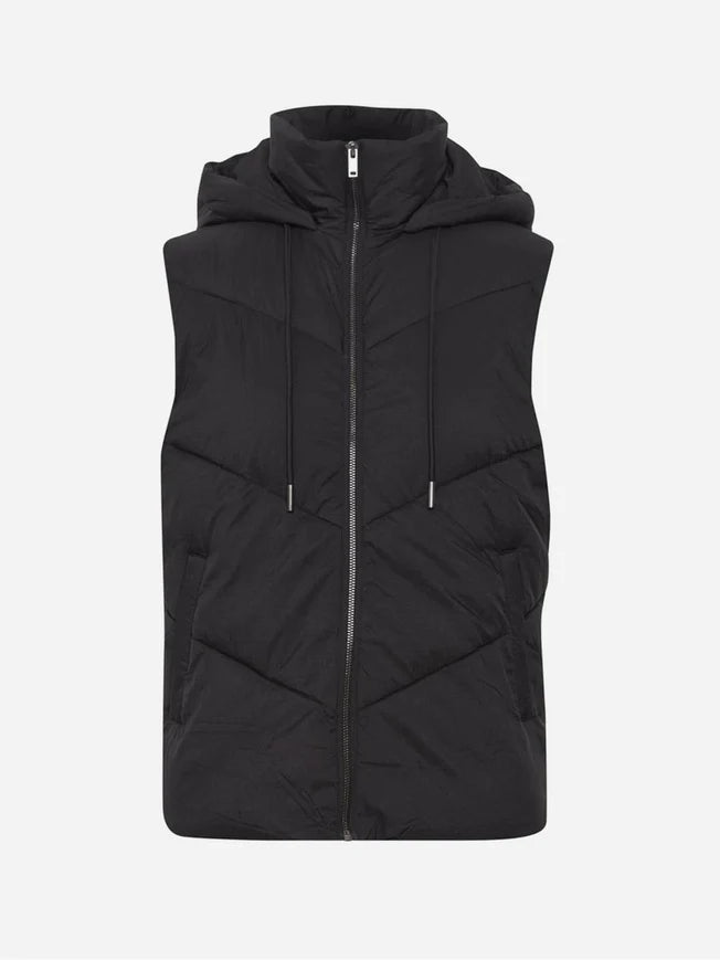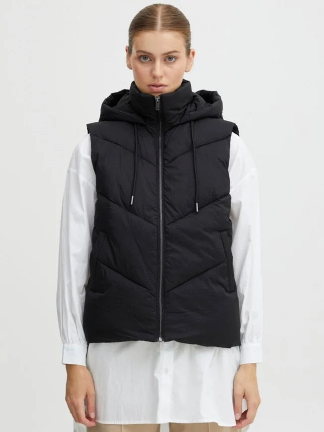 This warm but lightweight women's vest will accompany you in all your outdoor activities. Quilted vest, lightly lined, stand-up collar, hood with drawstring, closure with plastic zipper, straight hem, two side pockets, high-quality, robust material, straight cut.