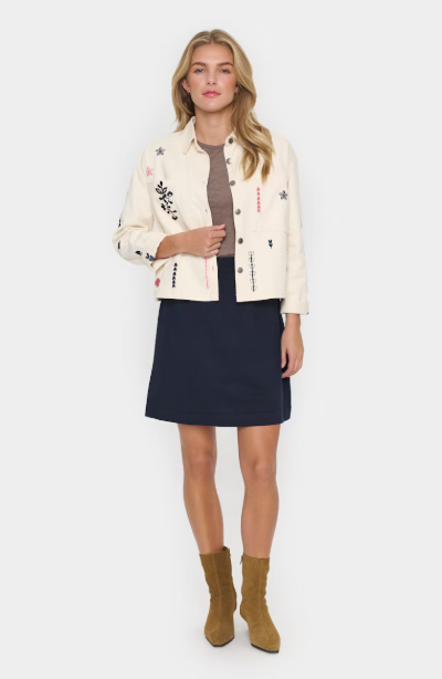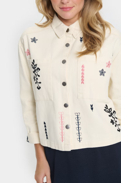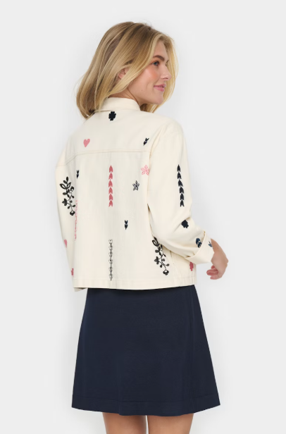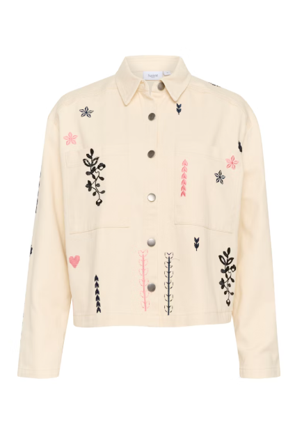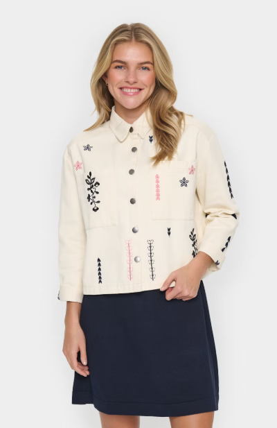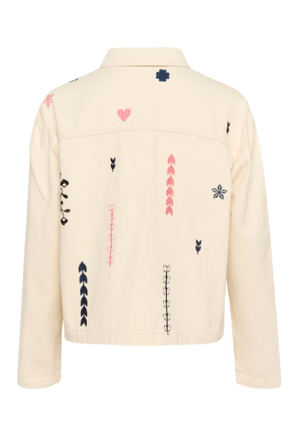 Off-white jacket with a straight fit and button closure. Features embroidered details and two chest pockets for a casual look. Made from a sturdy fabric with a soft feel. The model is 177 cm tall and wears a size M.