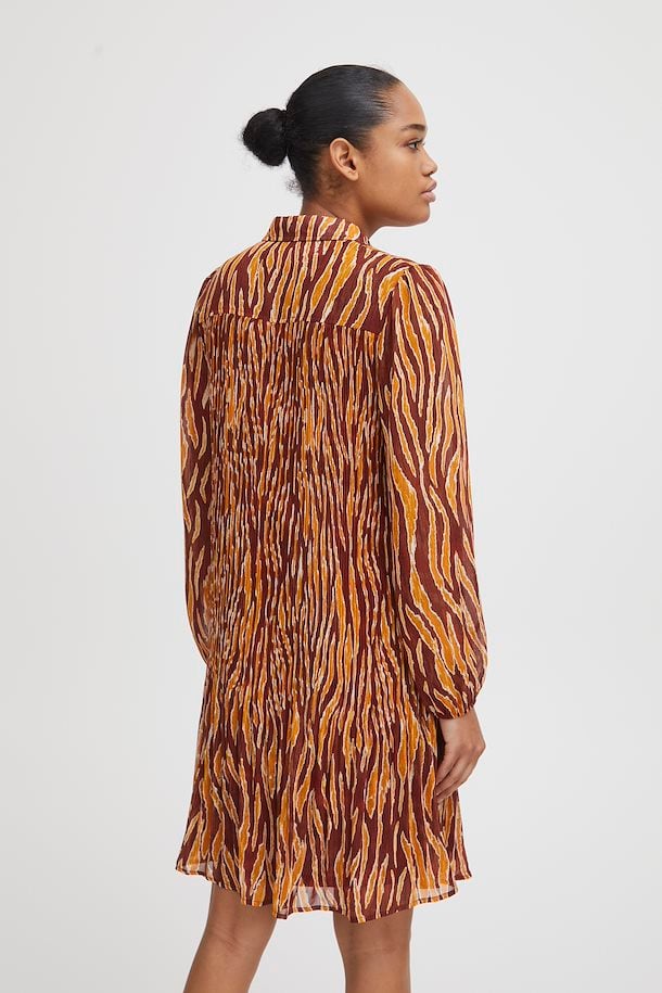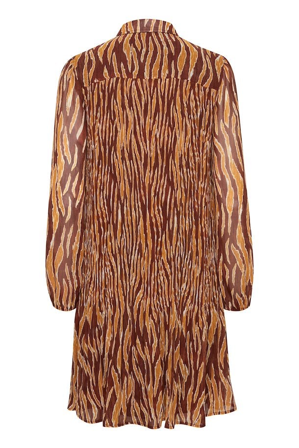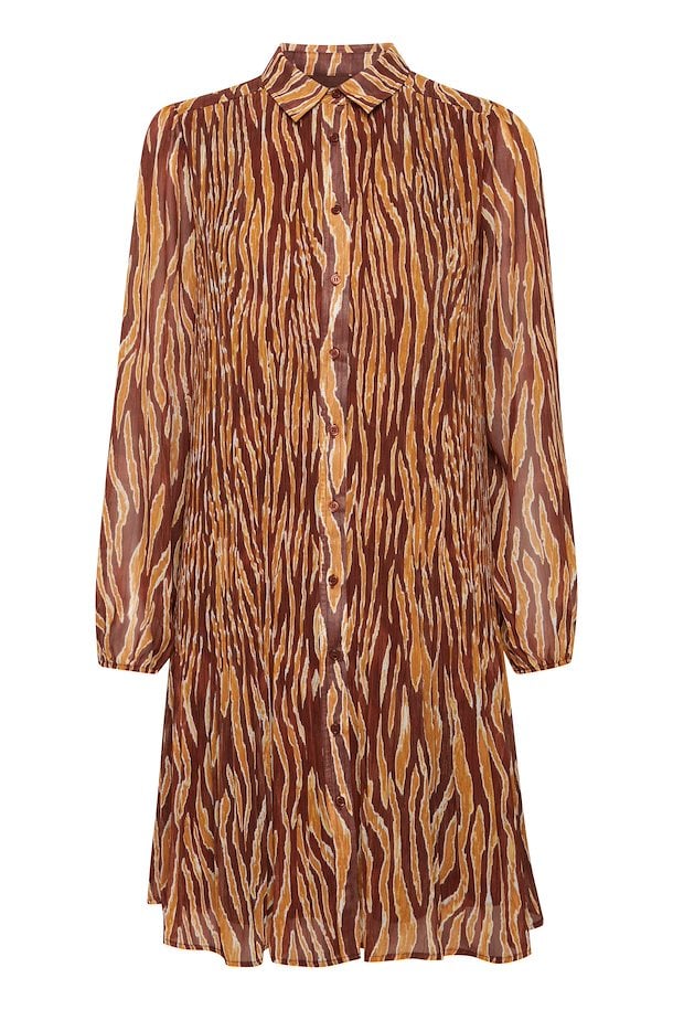 The dress has a shirt collar and closes with buttons at the front. It has long sleeves with elasticated cuffs. The pleats allow the dress to fall and float.