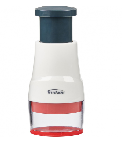 - Blades rotate with each press of the plunger to chop food smaller and smaller
