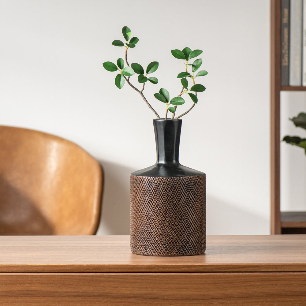 The etched details of this stylish resin vase is accentuated by the antiqued patina giving it a look of vintage pottery. Place on a shelf or table in the living room or front entry and fill with faux florals or twigs for a modern designer look.