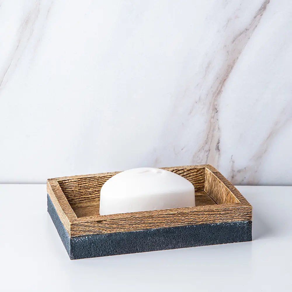 Add a fresh and new look to your bathroom countertop with the Kenora line from Moda At Home. This resin soap dish has the look and feel of natural stone, without the weight or breakability, and a wood accent. Complete your bathroom makeover with the rest of the pieces in the Kenora line for a clutter-free countertop.