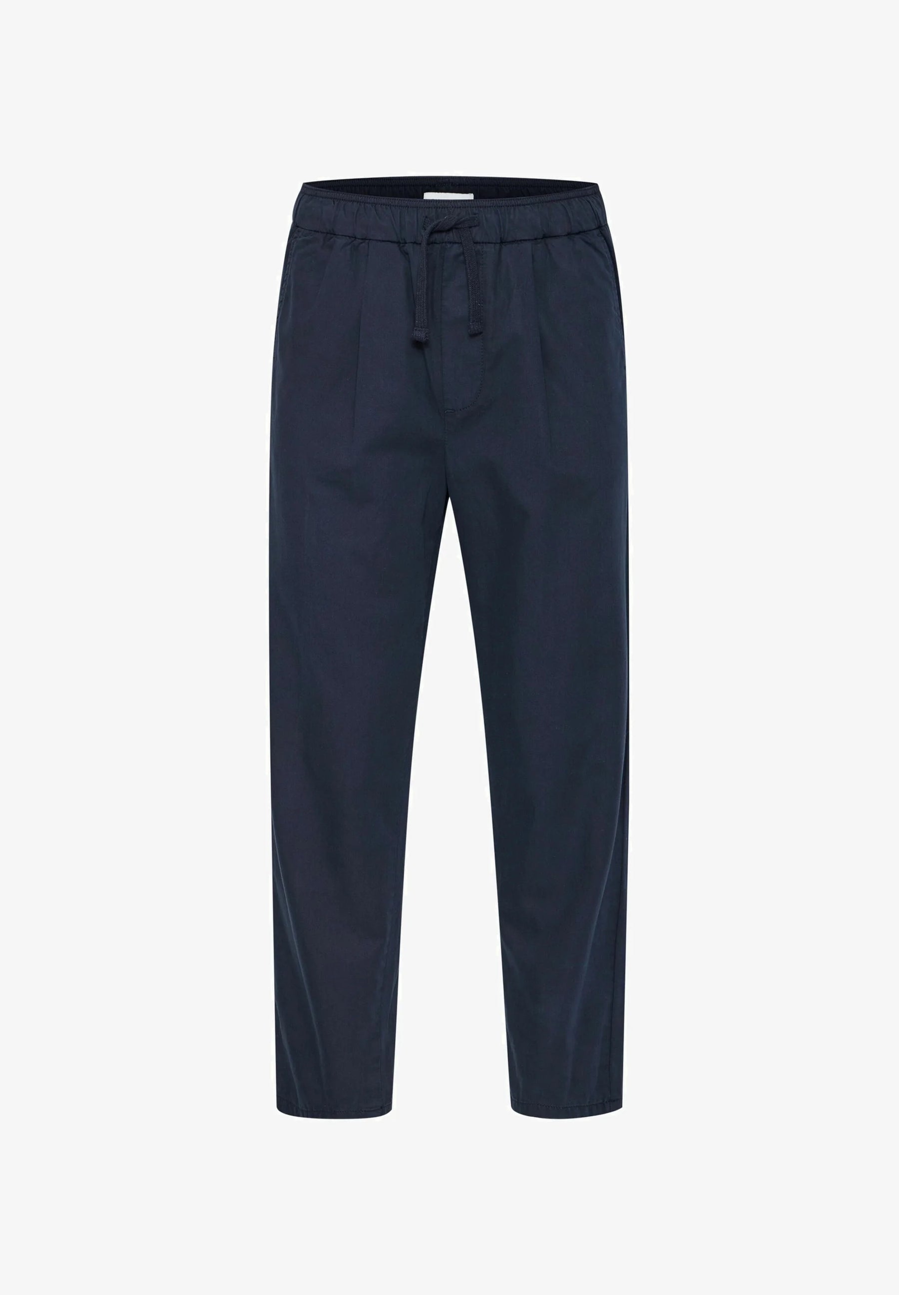 These versatile dark navy cotton-lyocell pants seamlessly transition from casual to dressed-up occasions, offering all-day comfort with effortless style.