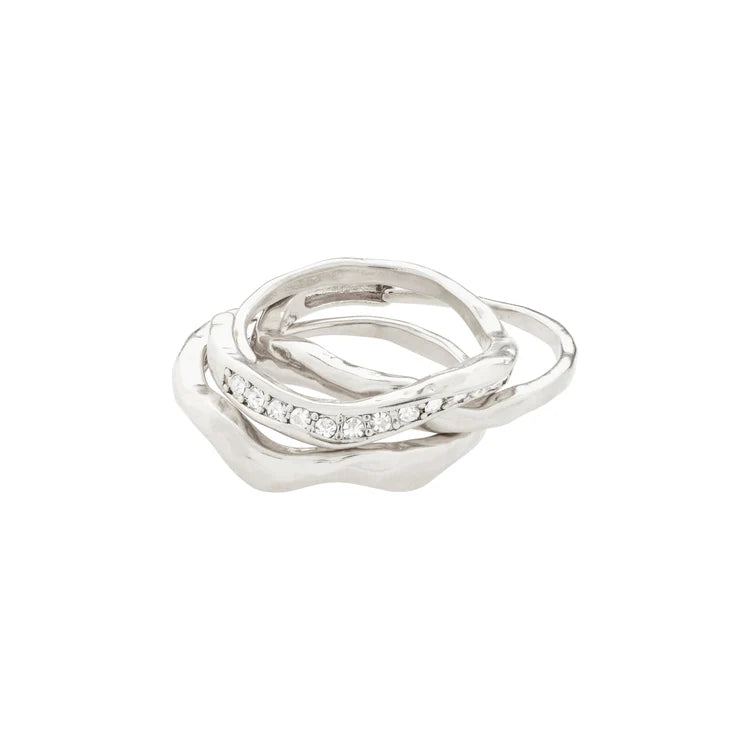 Add a little sparkle to your day with the 3 rings from the TRUE collection. Silver-plated, shiny rings with unique organic shapes - one with sparkling Preciosa crystals. A set of basic pieces that can be worn individually or in a beautiful stacked look. The rings are made of 95% recycled material and are adjustable in size.