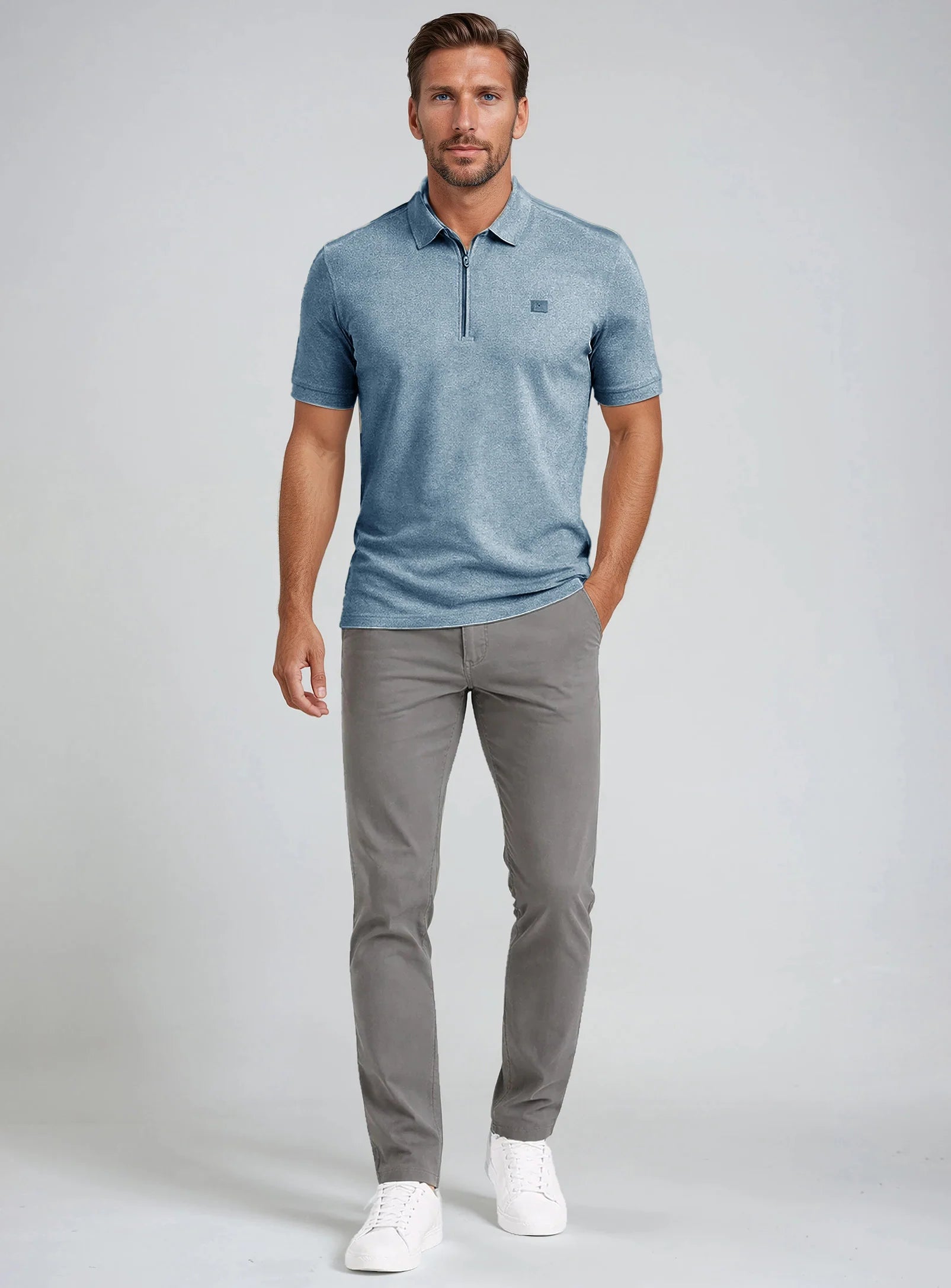 - Modern zip-placket collar design