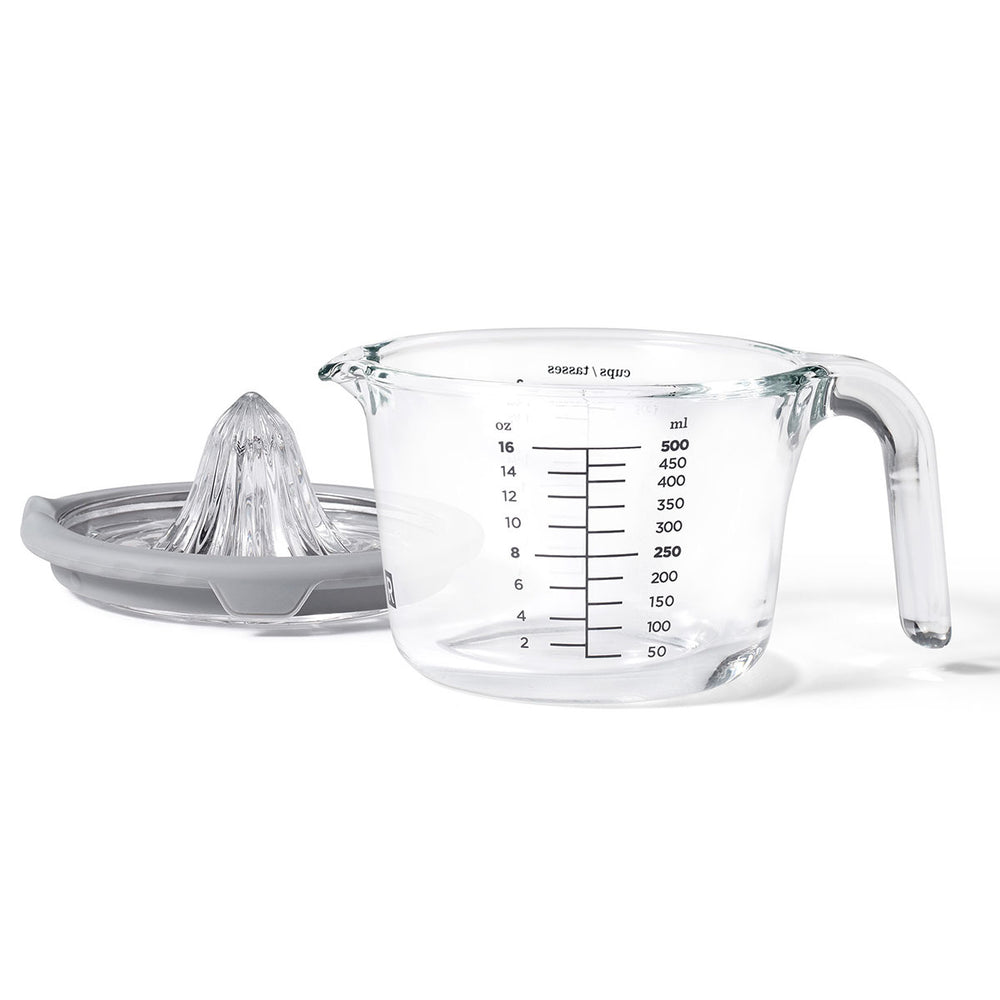 The RICARDO Measuring Cup with Citrus Juicer is an all-in-one tool for squeezing, measuring and pouring citrus juices for marinades, mixed drinks, and more. This measuring cup is fitted with a handy built-in strainer so you don’t need to worry about seeds making their way into your juice. Made of durable borosilicate glass, this 500 ml measuring cup is microwave and oven safe.