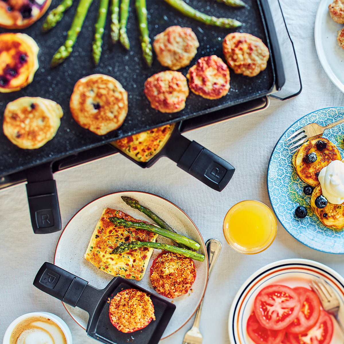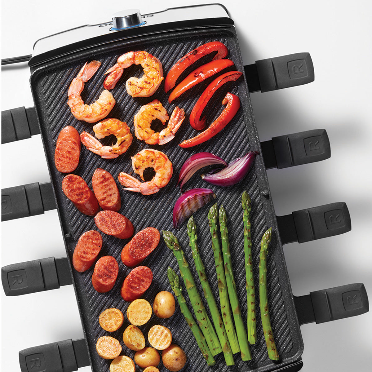 This RICARDO electric raclette features a high-performance The Rock reversible grill. The ribbed side lets eight people at a time grill their favourite meats, seafood or vegetables, and the flat side is ideal for cooking crepes or eggs. Like the grill, the eight included cooking pans feature a non-stick coating that makes them easy to clean and perfect for melting cheese. A quick and simple way to enjoy a delicious casual meal with family and friends!