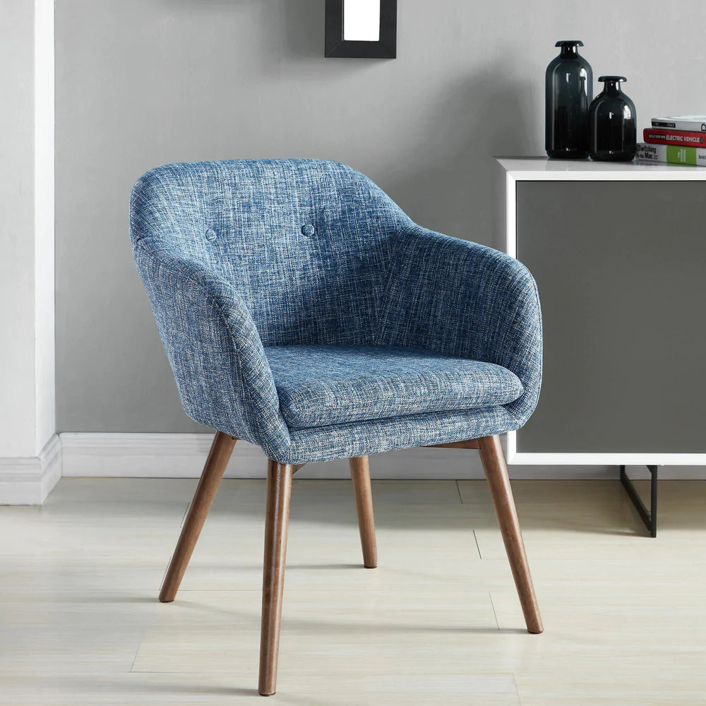 The sloped back and seamless organic silhouette of this chair reflects the bold design breakthroughs of the mid-twentieth century, while the button tufting recalls the classic luxury of an earlier age. Upholstered in a subtle, multi-toned blue-grey, this is an eye-catching and comfortable addition to your living room, study or bedroom.