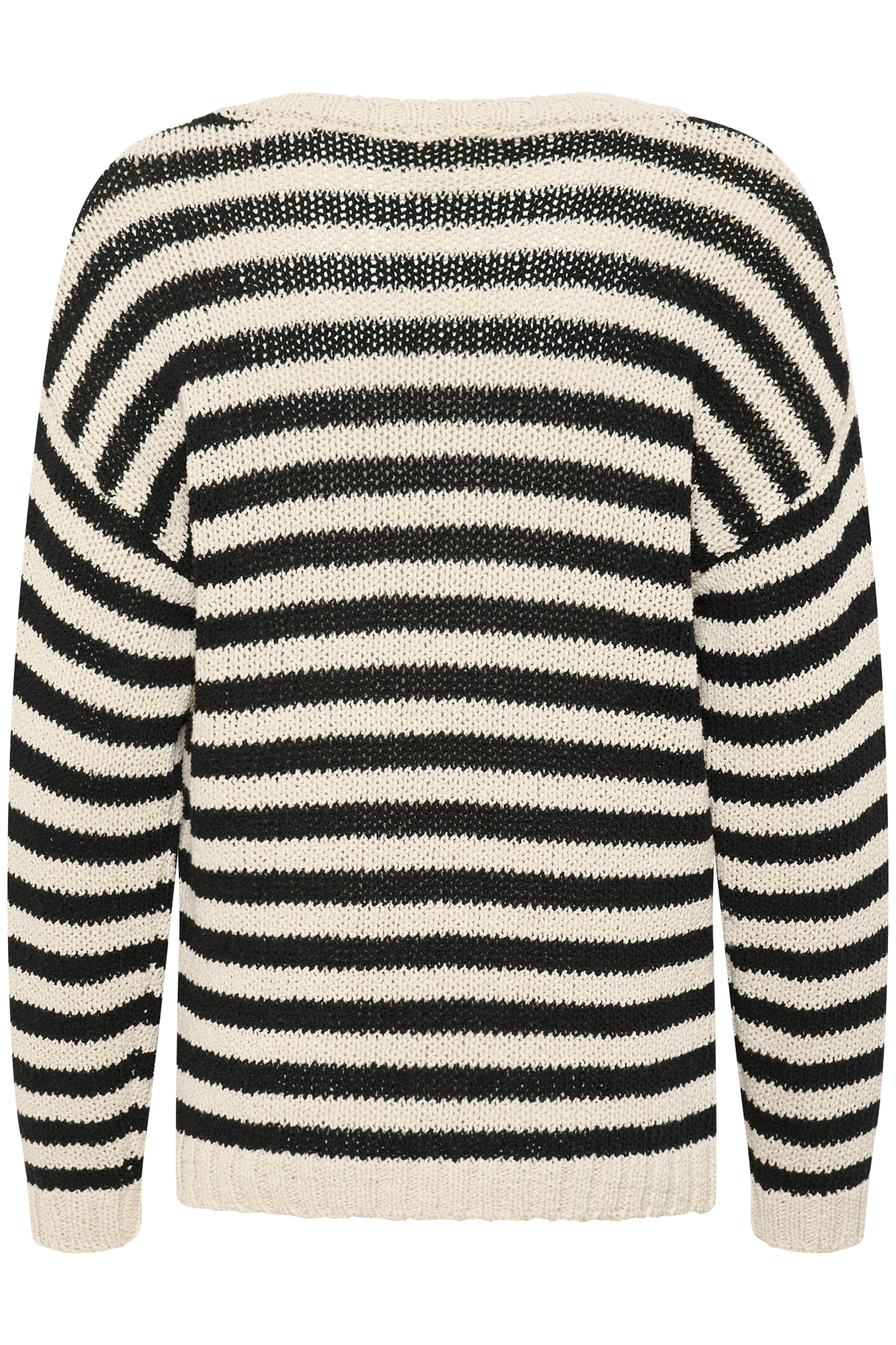 This openwork knit sweater transcends the simple status of a sweater: it embodies a subtle dialogue between graphic precision and handcrafted irregularity. Its deep black and natural cream stripes create a silhouette that is both assertive and relaxed, at the crossroads of handcrafted artistry and urban flair.