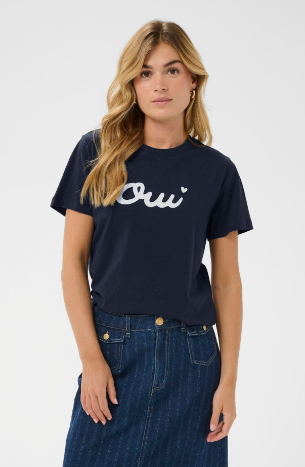 This t-shirt features a straight fit and a classic crew neckline. The design includes short sleeves and a soft, smooth finish. The front displays a prominent script detail across the chest.
