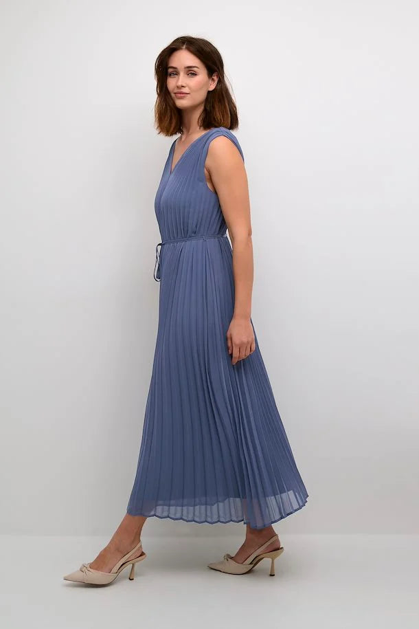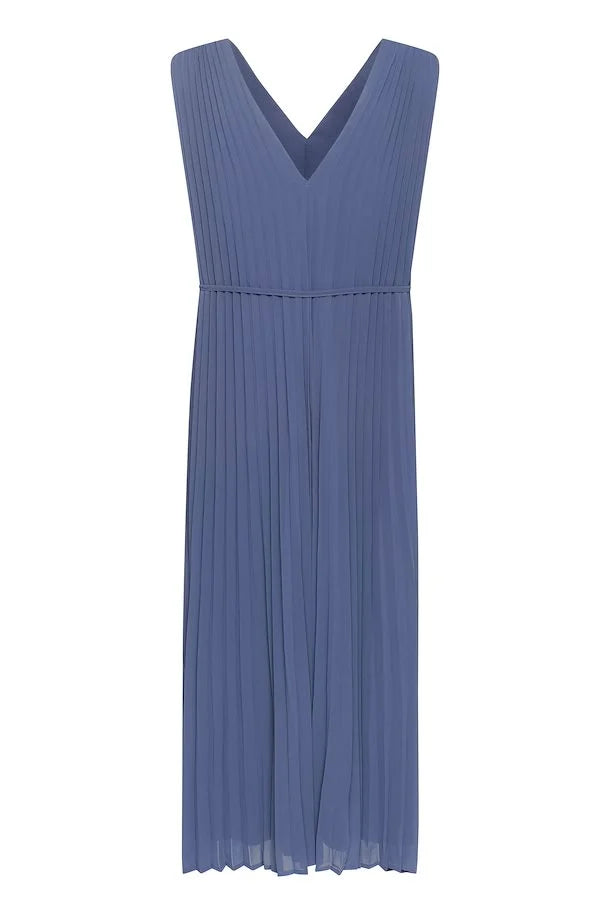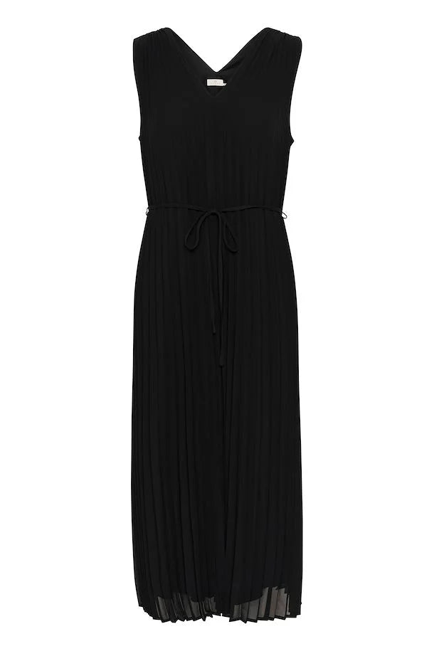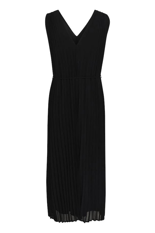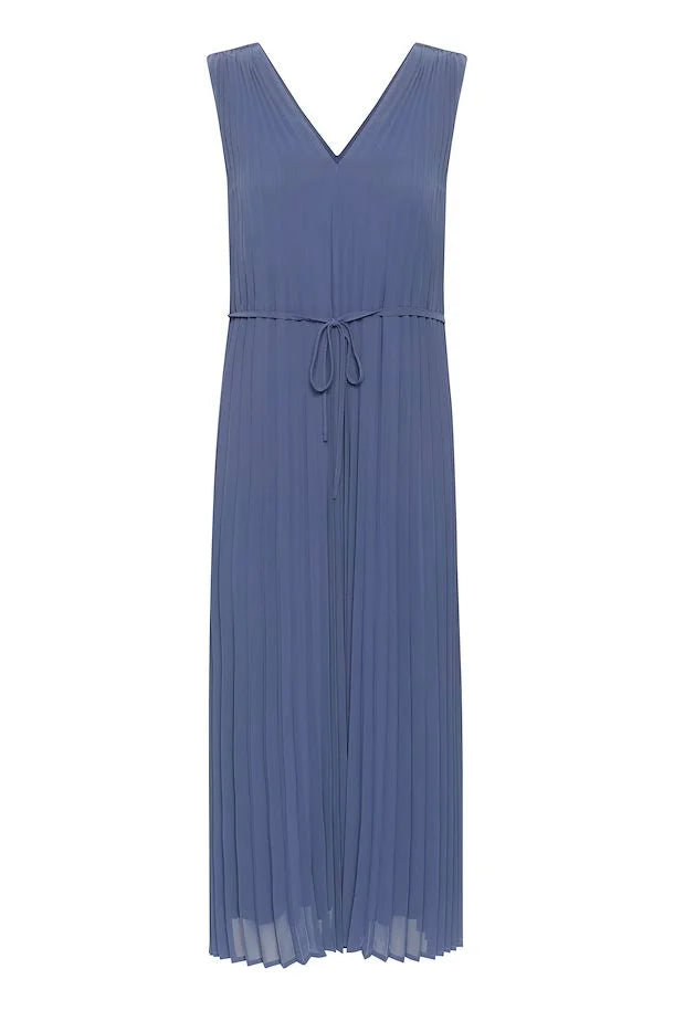 Sleeveless pleated dress with a V-neckline and midi length. Features a flowy silhouette and adjustable waist tie for a modern, effortless look.