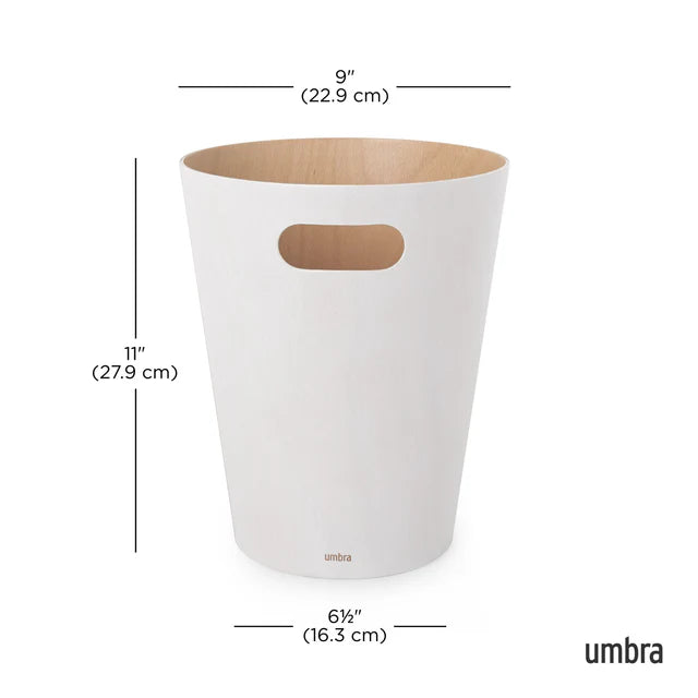 Upgrade your space with Woodrow, a modern waste can that adds both style and function to any room. Its sleek two-tone design, featuring a natural wood interior and a stained exterior, creates a warm and inviting atmosphere. With its integrated handles, Woodrow is easy to move, making disposal quick and effortless. The unique curved shape turns this everyday essential into a decor piece that stands out. Perfect for compact spaces like powder rooms, offices, or studies, Woodrow offers a 2-gallon (7.5L) capacity in a compact design. For best care, use a bag liner or avoid putting wet items directly against the wood surface.