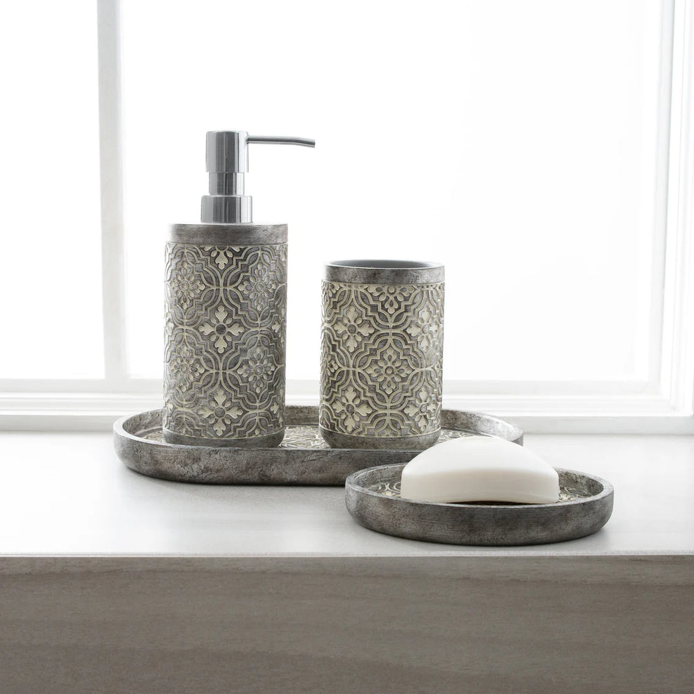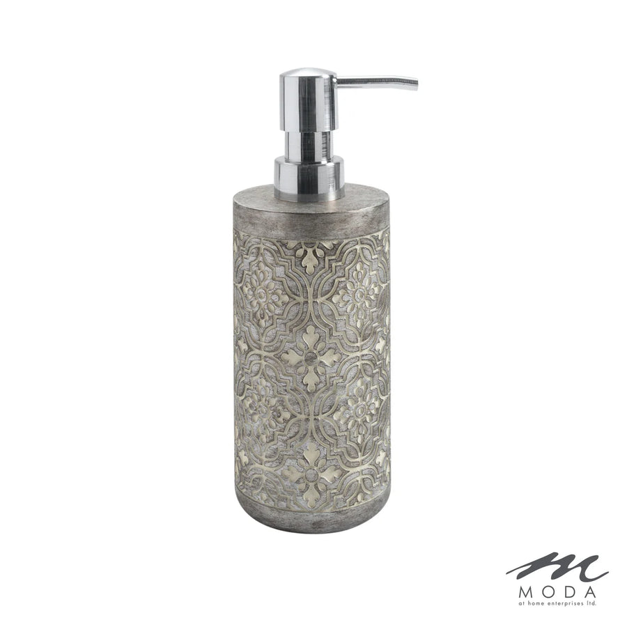 The Marrakesh bath collection, includes this elegant resin lotion/soap dispenser has a sleek and sturdy design that boasts a dark grey finish with delicate white accents and exquisite flowers that appear to be embroidered. Add a touch of sophistication to your countertop with this unique collection. This durable dispenser is perfect for daily use and holds up to 11 ounces of your favorite lotion or soap.