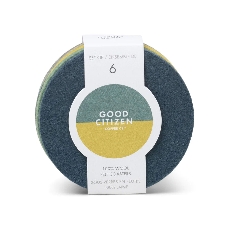 Modern and sustainable, the Good Citizen Mod Felt Coasters bring beautiful cool colors and function protection to your tablescape. This fun coasters set includes 6 round coasters that are certain to add flair to your entertaining accessories. Our felt coasters are made of wool which is a renewable and sustainable material. These drink coasters are perfect for protecting your coffee table, dining table, bedside table, and all your polished surfaces.