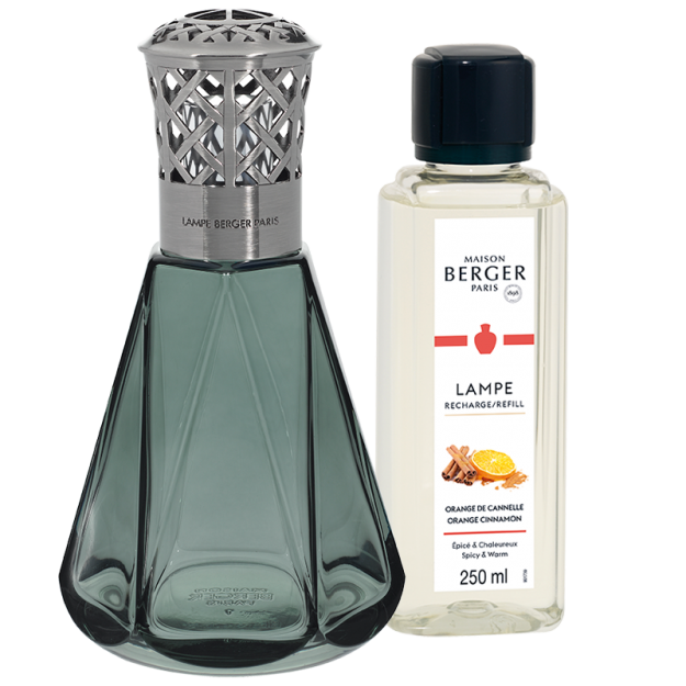 Le coffret contient la lampe Pyramide Berger vert antique et un flacon de 250ml Orange de Cannelle en cadeau.