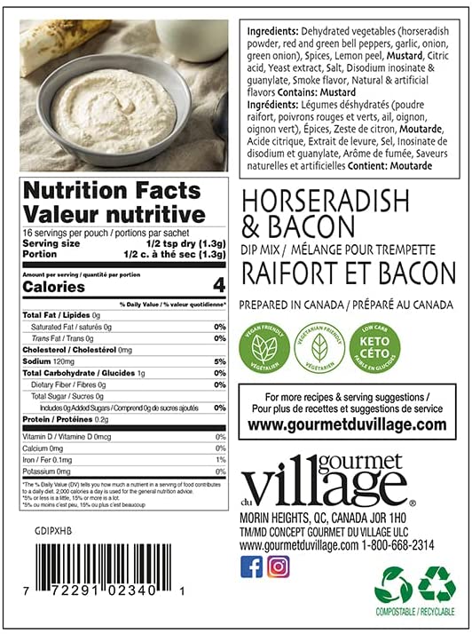 Cette trempette a un goût de raifort et de bacon fumé. Des trempettes légères, crémeuses et pleines de goût, préparées en quelques minutes, il suffit d'ajouter des ingrédients frais ; de la crème sure, de la vraie mayonnaise, de refroidir et de servir. Elles sont encore meilleures si on les laisse au réfrigérateur pendant quelques heures ou toute la nuit. Nos trempettes sont préparées avec les meilleurs ingrédients, des mélanges naturels d'herbes et d'épices, des légumes secs et des fromages relevés. Vous fournissez les bases de la cuisine, nous fournissons le goût qui fera que votre famille et vos invités en redemanderont et vous demanderont votre recette. Conservez les mélanges d'assaisonnements séchés dans un garde-manger ou un placard frais, sec et sombre pour une durée de conservation plus longue.