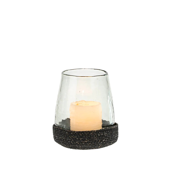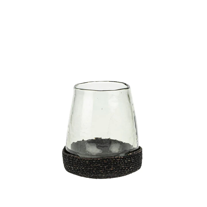 Handmade from Indian glass, the Drift Hurricane brings a crafted quality with textured glass and a black woven jute base. Style it with a pillar candle for soft lighting and a sense of drama during al fresco dinners, or as a vase with a bouquet of fresh blooms.