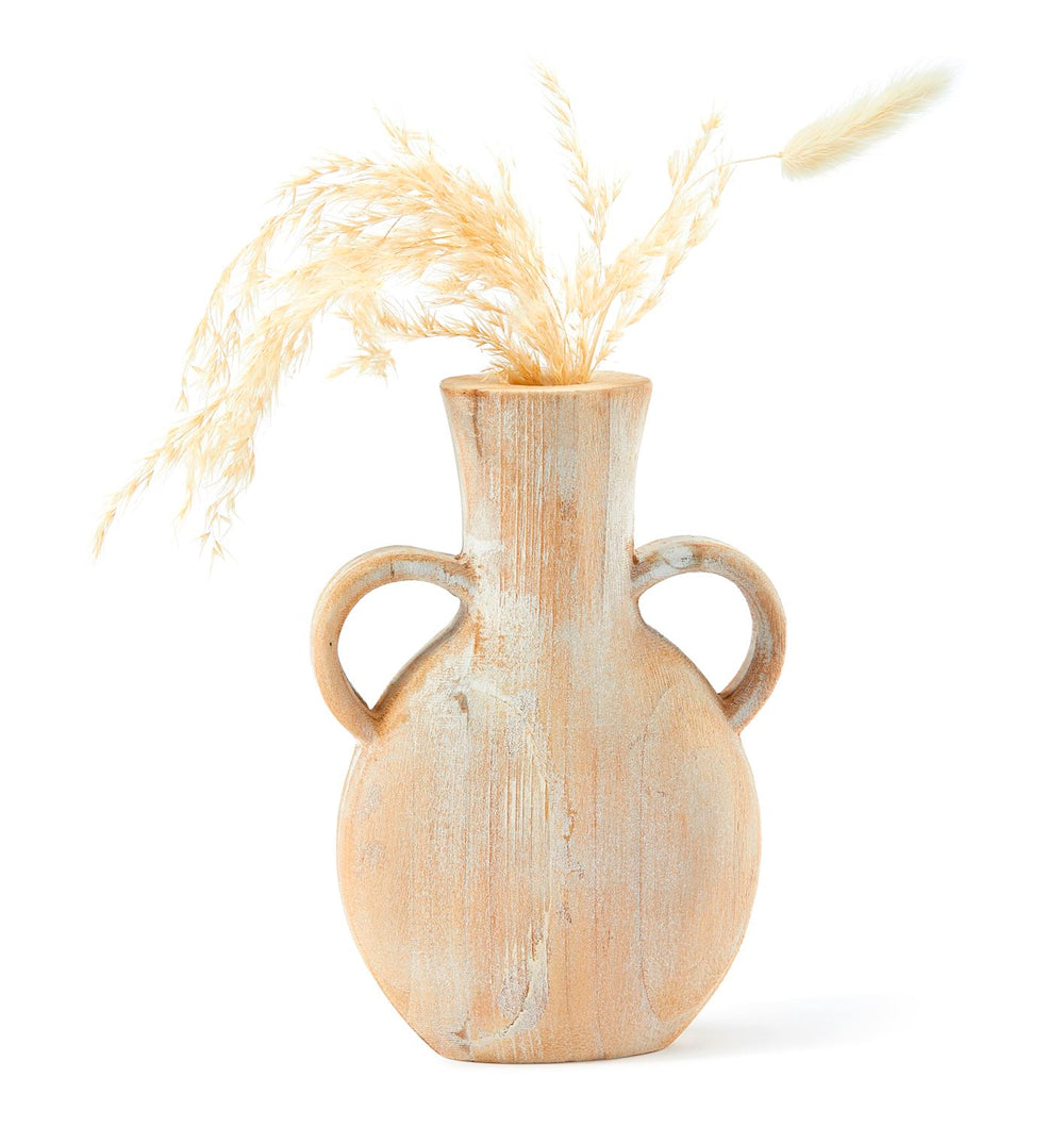 Style your space with flowers or branches in this stunning Vintage Fir Wood Table Vase. Crafted from fir wood with an antique-like aesthetic, this light brown vase features a textured lined finish and two small side handles. Lightweight and durable, this charming vase has a narrow opening to add fresh flowers or decorative branches inside to add whimsy and character to any tabletop or mantel. Fir Wood.