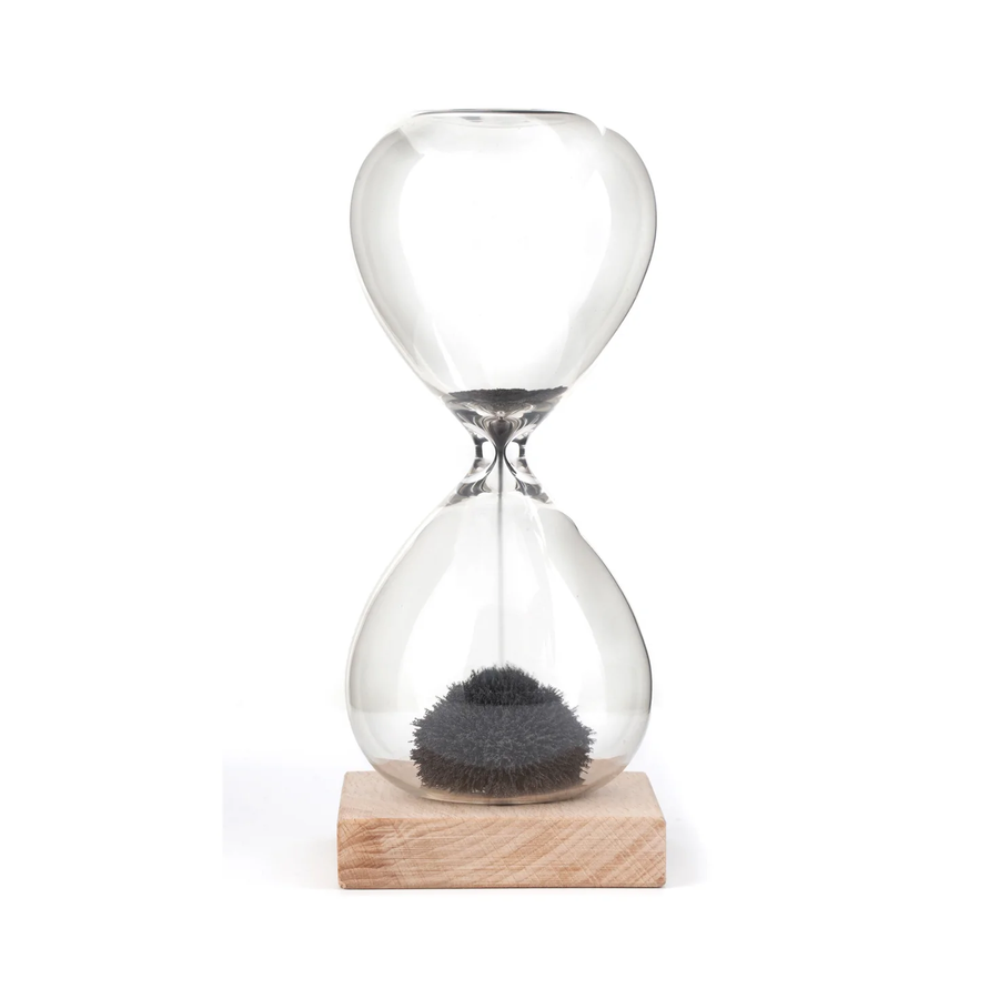 The Kikkerland Magnetic Hourglass is more than your classic minute timer. Turn it over and watch the metal filling fall into fantastic shapes. Features a beautiful, classic glass body and attractive wood base.
