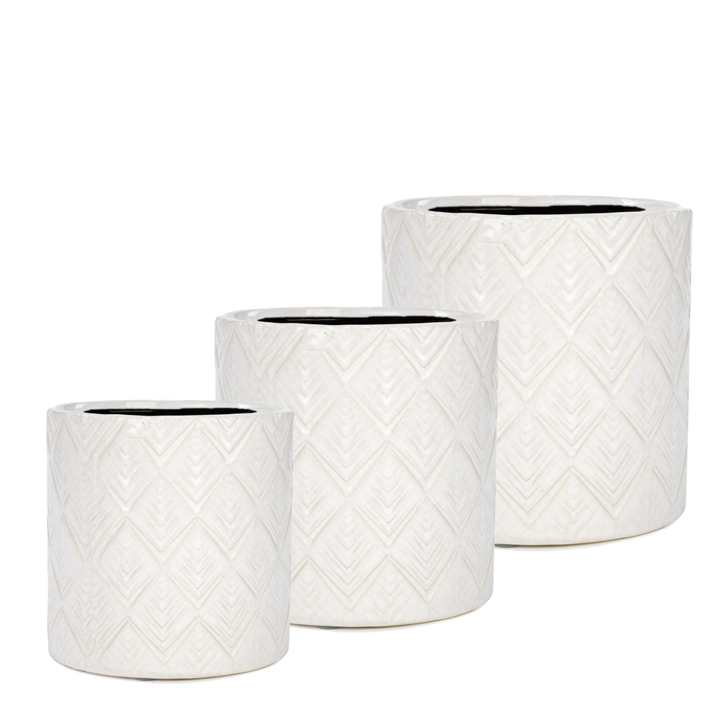 Cache-pot dans un ton ivoire avec un motif en forme de diamant et un effet vieilli. Magnifique et parfait pour les vraies ou fausses plantes.