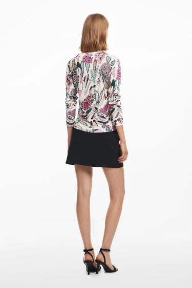 Long-sleeved round neck knitted sweater with autumnal plant and flower print