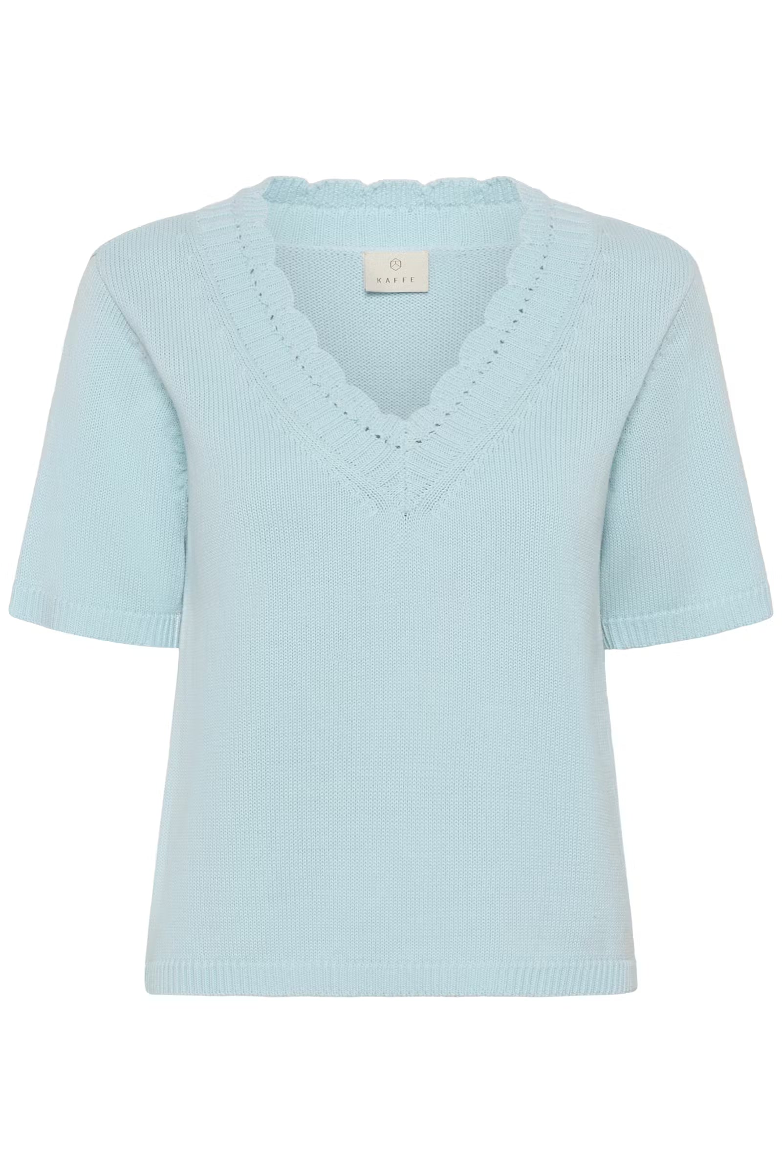 Short sleeve knit top with a scalloped V-neckline and soft-textured finish. The straight silhouette creates an effortlessly refined look with subtle ribbed edges.