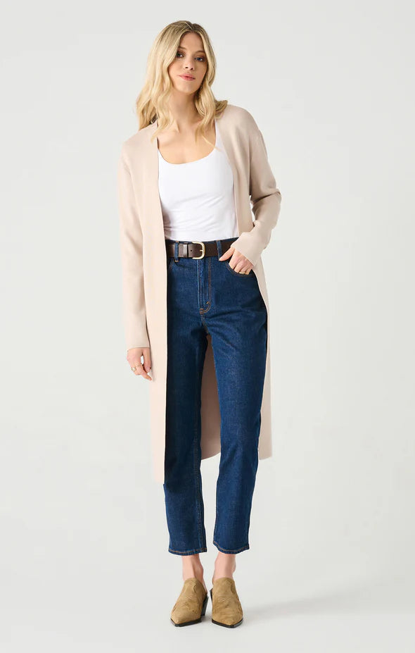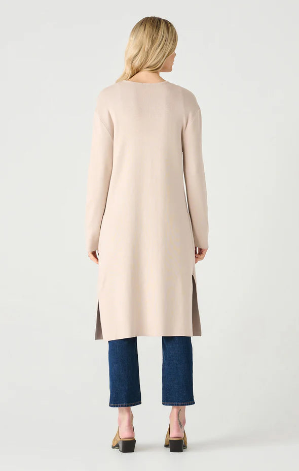 - Longline open cardigan, two front pockets, full length sleeve, tight knit.