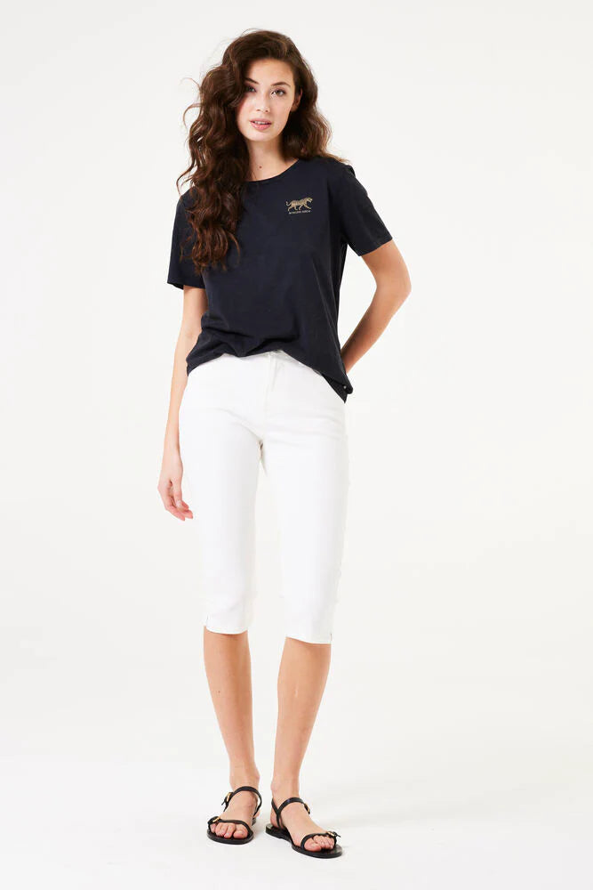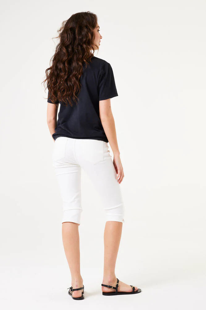 The Celia 277 is a denim capri with a slim fit and high waist. A capri is characterized by the pant legs that fall just below the knee. This creates a summery look that isn't too exposed. At the bottom, these capris have small slits on the sides, so you can move freely without the pants being too tight at the back of your knees.