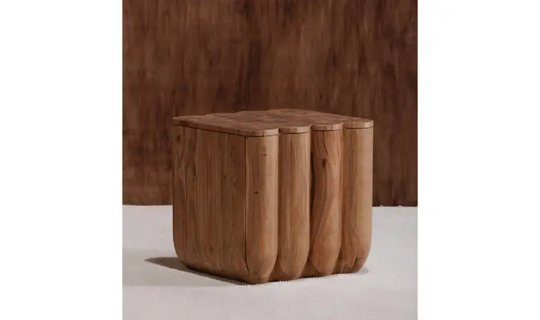Punyo Punyo is a playful interpretation of rhythm and repetition—a waved silhouette made of Acacia wood. While this accent table's expressive profile adds visual and tactile appeal to any interior setting, this design also utilizes end-grain pieces that come together into a beautifully patterned tabletop. Punctuating this distinctive piece is a unique seam that runs along with the tabletop joinery technique, visible throughout the piece's side profile.