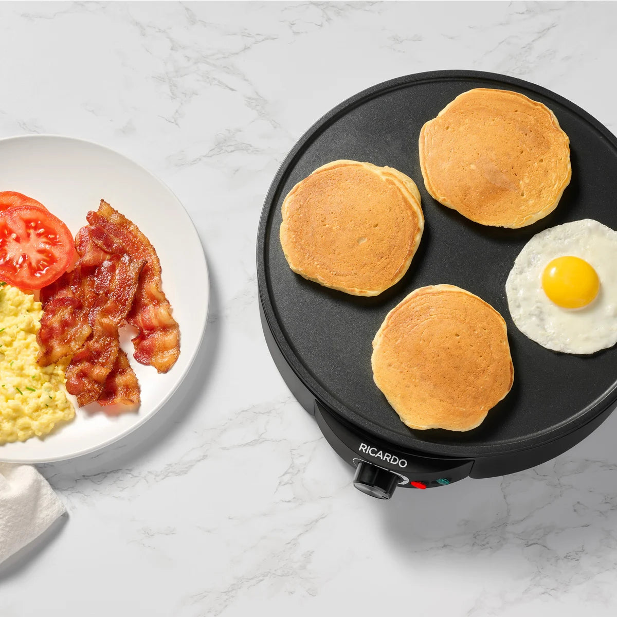 Enjoy light and golden crepes with the RICARDO electric crepe maker! Its large non-stick surface ensures even cooking, while the variable temperature control guarantees perfect results every time. Versatile, it also doubles as a griddle for pancakes, eggs, and bacon. Conveniently, it includes a batter spreader and a dishwasher-safe spatula.