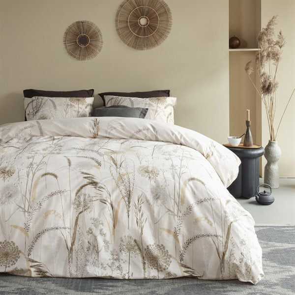 - Flowered duvet cover set in shades of beige and soft grey on a natural background